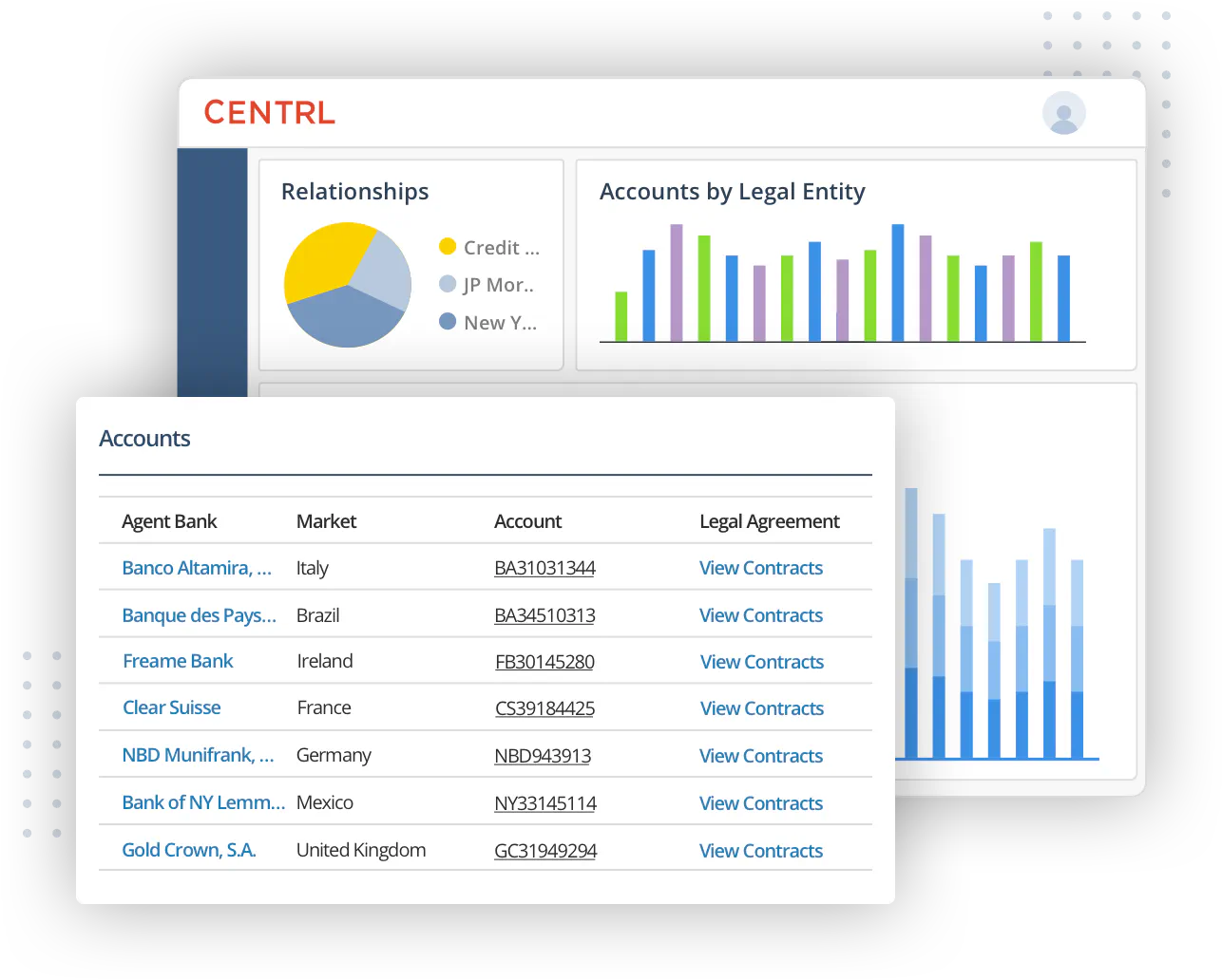 - Track all accounts along with associated agent bank, legal relationships, and agreements